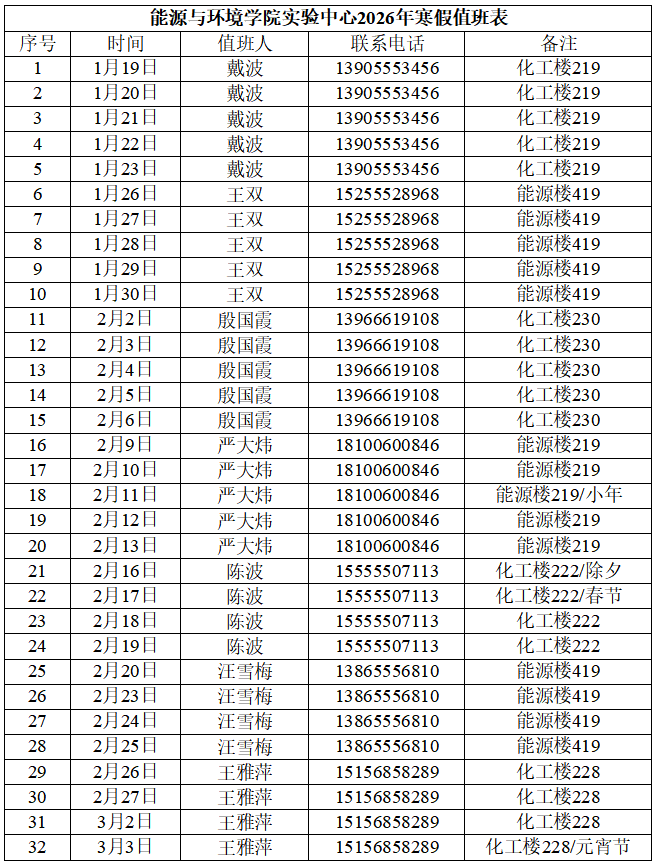 能环学院实验中心2026年寒假值班表